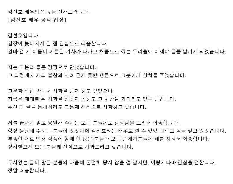 온라인 '낙태 회유' 폭로글에 새글 덧붙여…"마음 좋지 않아" 배우 김선호로부터 낙태를 회유 받았다고 주장한 전 여자친구가 그로부터 사과를 .